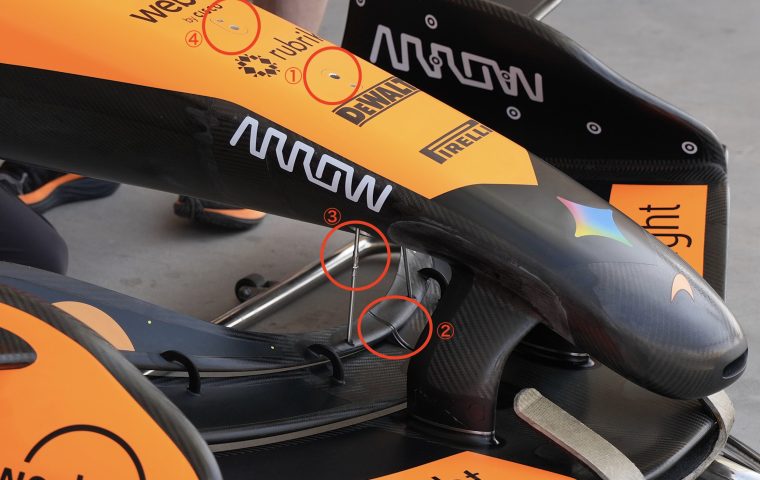 バーレーン合同テストで2026年型マシンや各チームのピットガレージをつぶさに観察してみると、フロントウイングのフラップ...