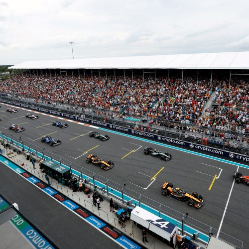 マイアミGPのスプリントレースはウエットコンディションとなったためセーフティカー先導で始まって16周に減算となり、スタ...