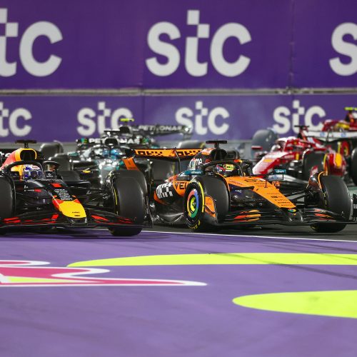 サウジアラビアGP決勝の1周目ターン1でマックス・フェルスタッペンとオスカー・ピアストリが2台並んでアプローチし、フェ...