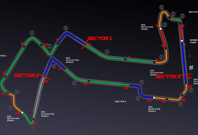 サーキット1周を24個のミニセクター(セグメント)に分類し、予選Q3のアタックラップで各ミニセクターの最速を刻んだドライバーを図表にすると以下のようになる。