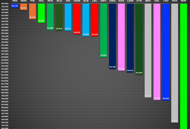スプリント予選における各ドライバーの自己ベストタイムだけでなく、自己ベストセクタータイムを並べ、それらを足して理論上可能な実力(IDEAL LAP TIME=理論値)を集計すると以下のようになる。