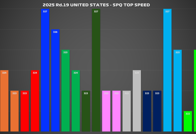 FP1とスプリント予選で各ドライバーが自己ベストタイムを記録したラップでの最高速をまとめると以下のようになる(※セッション全体の自己ベストはトウが効いた状態の実利的でない数値となるため、自己ベストタイムを記録したアタックラップの数値を取ることでより実質的な最高速を把握している)。