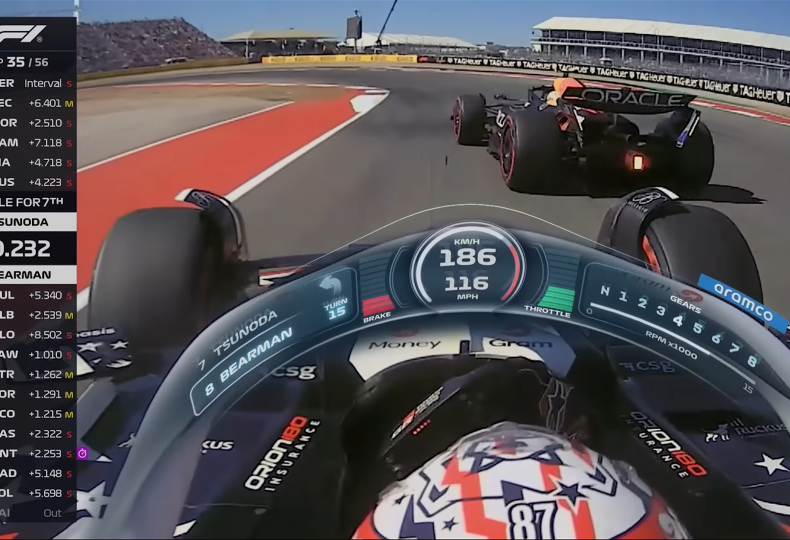 角田裕毅はUSGP決勝の34周目のターン15でオリバー・ベアマンと交錯し、ベアマンがコースオフしてポジションを落とした。