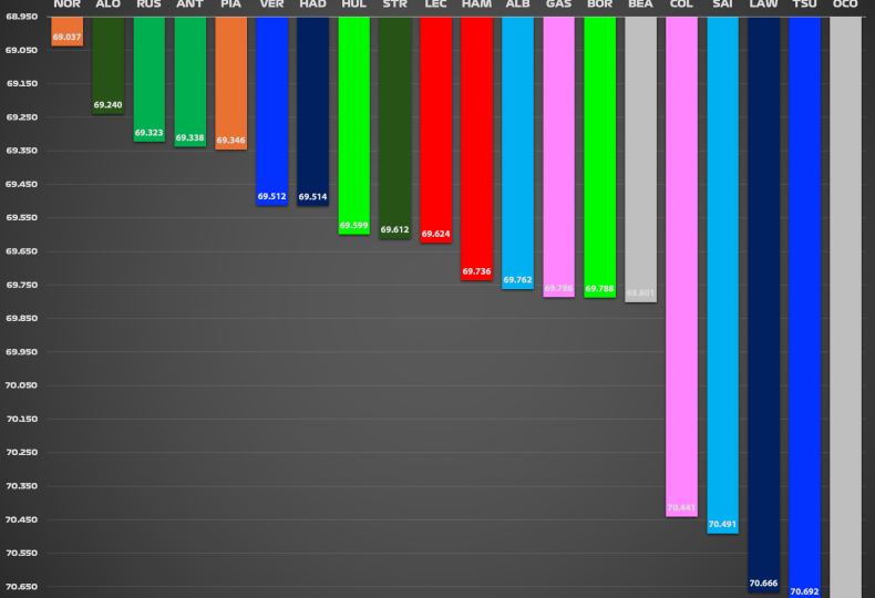 スプリント予選における各ドライバーの自己ベストタイムだけでなく、自己ベストセクタータイムを並べ、それらを足して理論上可能な実力(IDEAL LAP TIME=理論値)を集計すると以下のようになる。