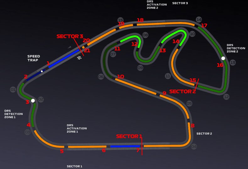 サーキット1周を21個のミニセクター(セグメント)に分類し、スプリント予選SQ3のアタックラップで各ミニセクターの最速を刻んだドライバーを図表にすると以下のようになる。
