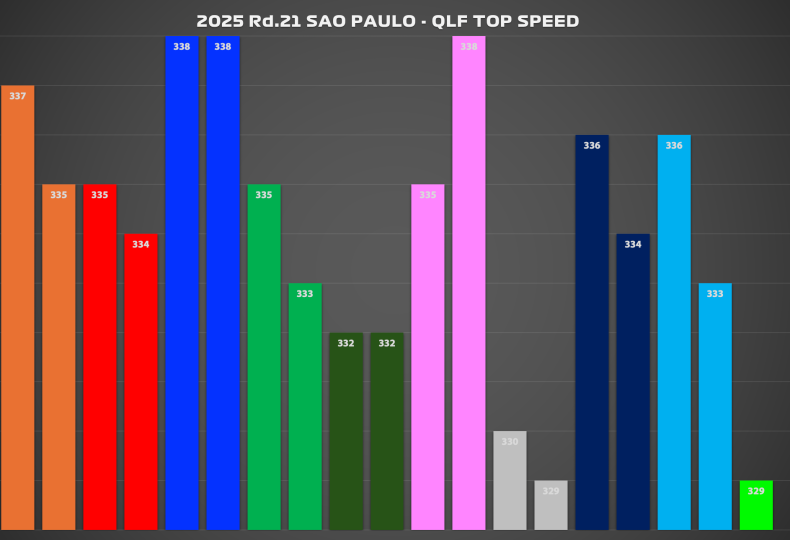アウトドローモ・ホセ・カルロス・パチェのスピードトラップはメインストレートエンドのターン1の90m手前の地点で計測しており、ストレートエンドのDRSオン時の最高速が分かる。