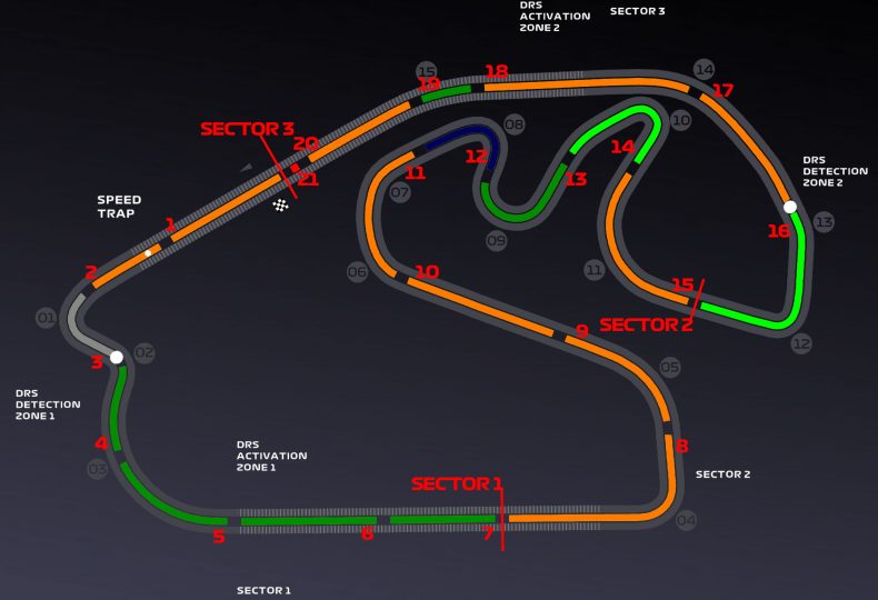 サーキット1周を21個のミニセクター(セグメント)に分類し、予選Q3のアタックラップで各ミニセクターの最速を刻んだドライバーを図表にすると以下のようになる。