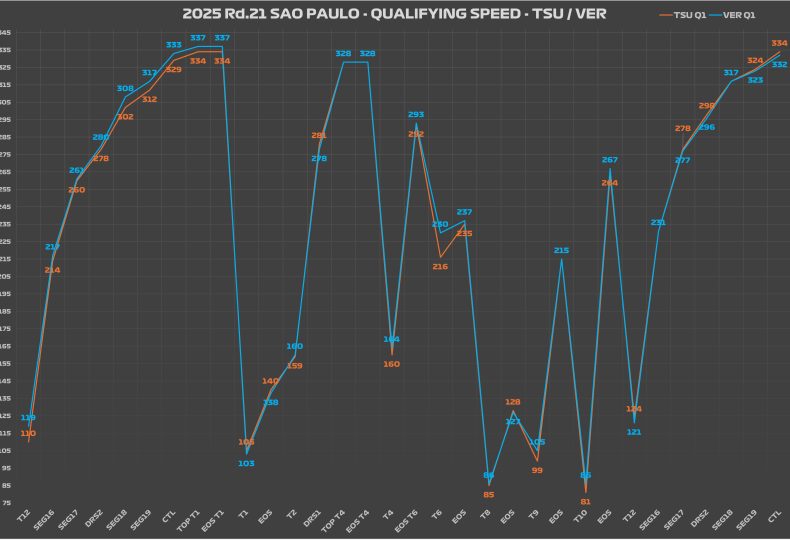 2025年第21戦サンパウロGPにおける全10チームの各マシンがどんな特性を持っていたのかを、予選パフォーマンスから分析していこう。シーズン後半戦を戦う各チームのハイダウンフォース仕様の競争力を読むことができる。