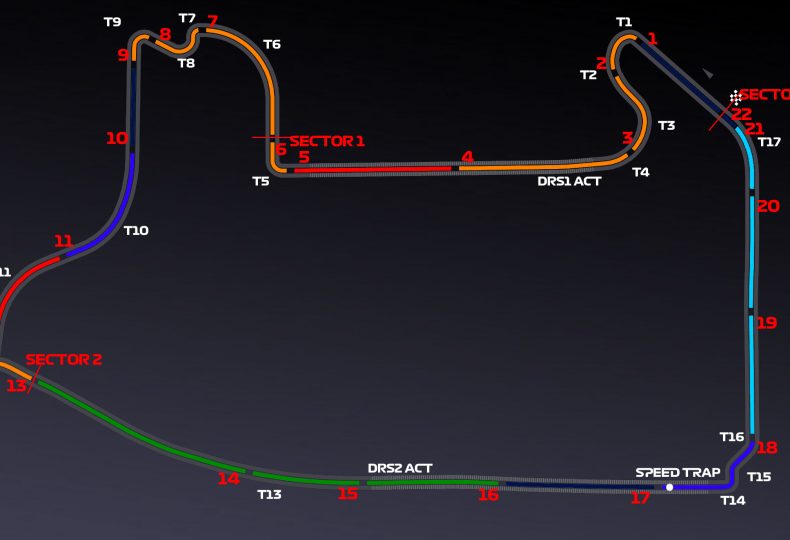 サーキット1周を22個のミニセクター(セグメント)に分類し、予選Q3のアタックラップで各ミニセクターの最速を刻んだドライバーを図表にすると以下のようになる。