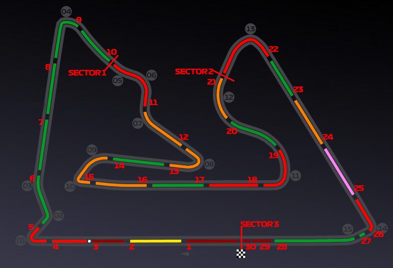 サーキット1周を30個のミニセクター(セグメント)に分類し、午前・午後のセッションで各ミニセクターの最速を刻んだドライバーを図表にすると以下のようになる。