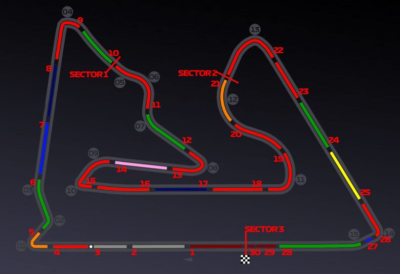 サーキット1周を30個のミニセクター(セグメント)に分類し、午前・午後のセッションで各ミニセクターの最速を刻んだドライバーを図表にすると以下のようになる。