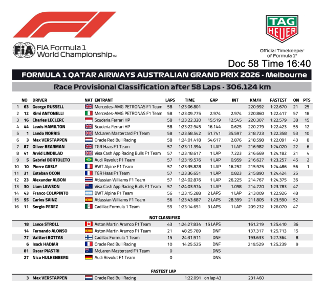 首位に立ったラッセルはタイヤマネージメントやエネルギーマネージメントに徹しながらマシンをフィニッシュまで運び、58周を走り切って危なげなくトップでチェッカーを受け2026年の開幕戦を勝利で飾った。アントネッリも5秒差で走行を続け、メルセデスAMGが1-2フィニッシュを飾った。