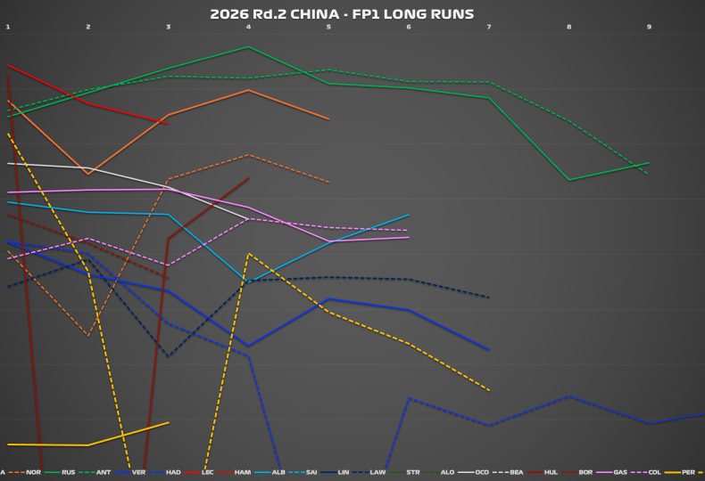 中国GPのFP1において行なわれたロングランを比較し、各マシンのペースとタイヤマネージメントの優劣を分析していこう。