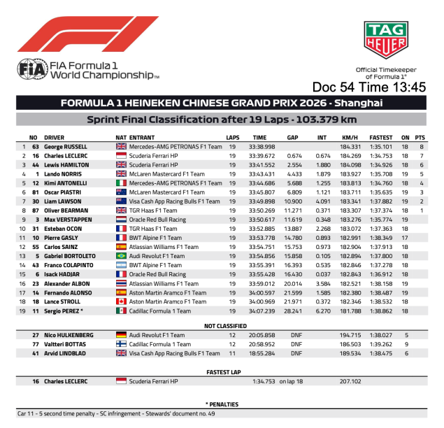 7周目にアントネッリはノリスも抜いて4位に上がるが、1周目の接触に対し10秒加算ペナルティが科された。