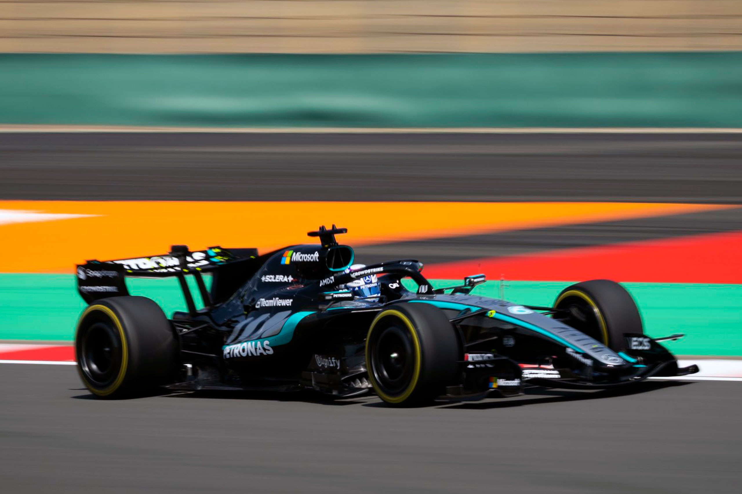 左フロントタイヤにグレイニングが発生してペースが上がらないハミルトンを、8周目のターン1でルクレールが抜いて2位へ。この間にラッセルとは1.9秒差となった。9周目のターン1でハミルトンがルクレールに並びかけるが、ルクレールはターン3でなんとか抑え込む。この間にギャップはさらに3.2秒まで拡大してしまい、背後にはアントネッリが追い着いてくる。9周目以降は単独走行となったラッセルが好ペースで引き離す。