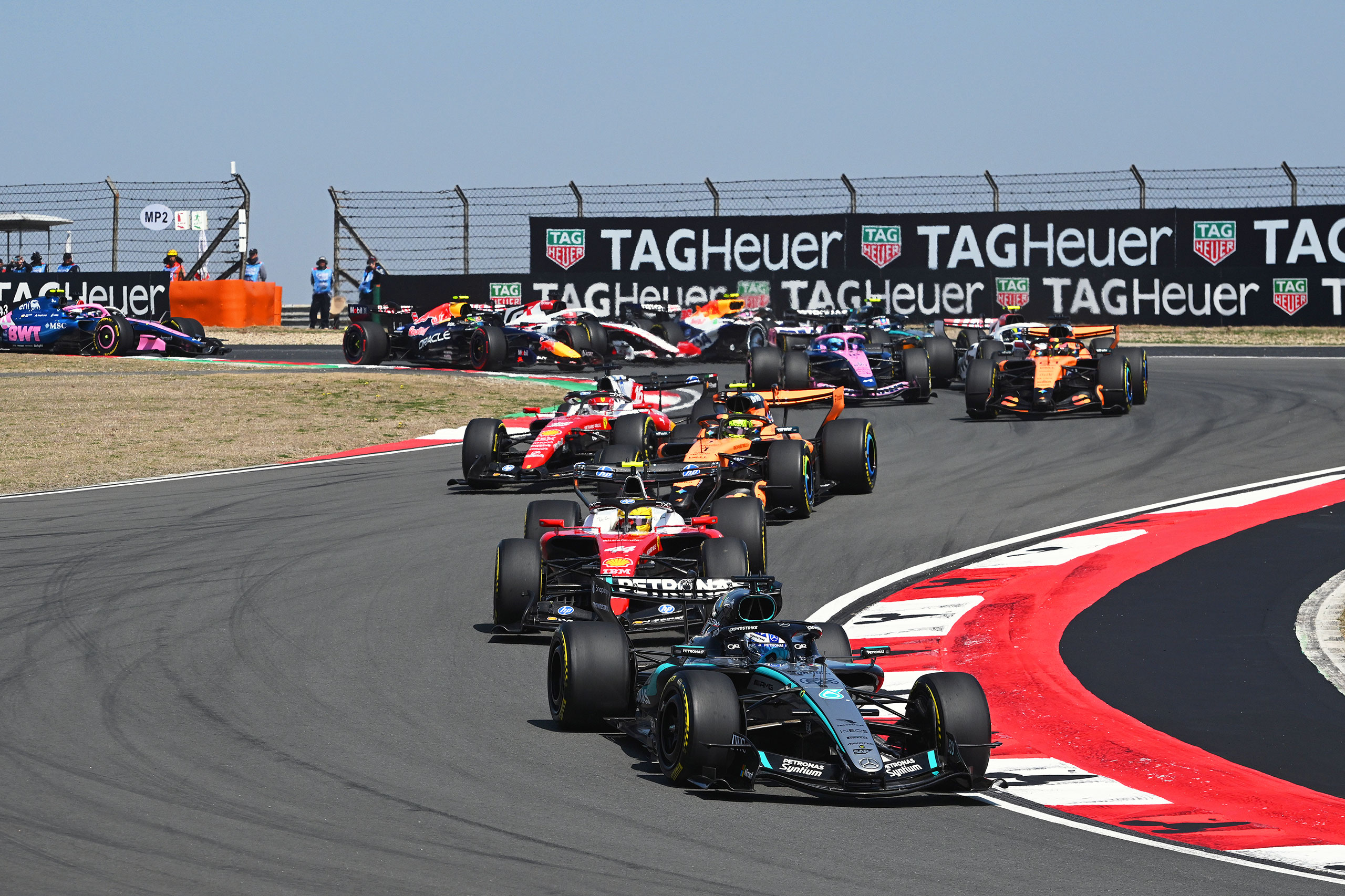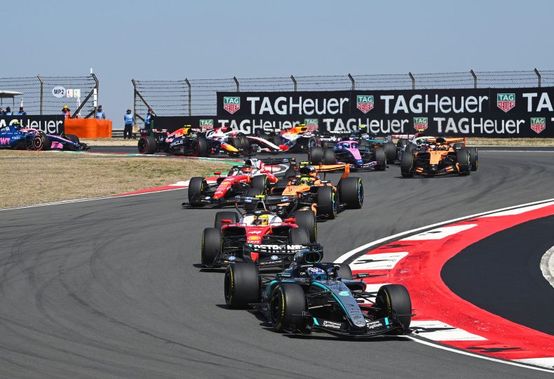 スタートでポールポジションのジョージ・ラッセルが好発進を決めた一方、2番グリッドのアンドレア・キミ・アントネッリはホイールスピンで大きく出遅れ、3番グリッドのランド・ノリスがラッセルの背後へ。好発進のルイス・ハミルトンがターン2〜3でノリスを交わして2位に上がり、さらにターン9でインに飛び込んでラッセルをパスしトップに立った。