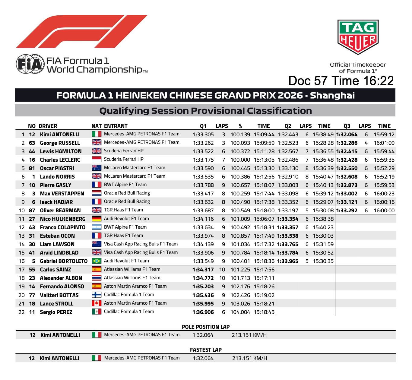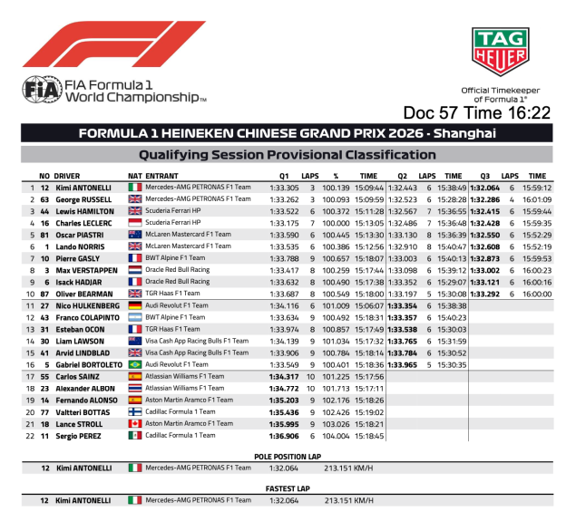 アントネッリがセクター3最速で1分32秒064でトップに立ち、ラッセルはターン1〜2でスナップしてセクター2でバッテリー切れを起こして0.222秒届かず2位。アントネッリが史上最年少のポールポジション獲得を決めた。