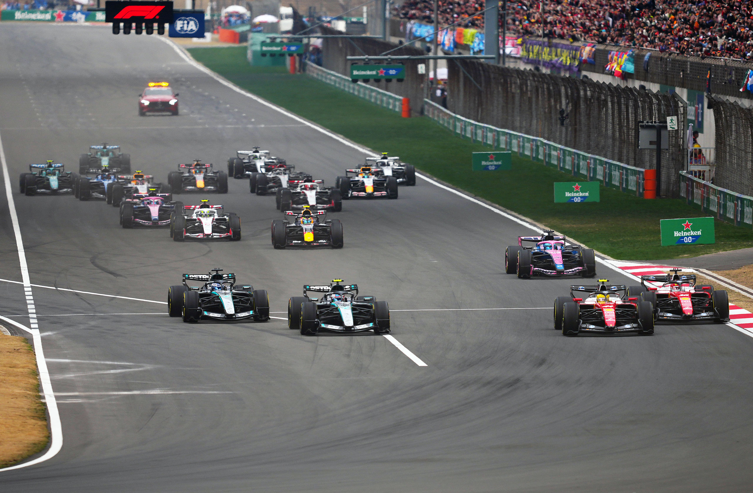 第2戦中国GP決勝は、スタートでフェラーリ勢が好発進を決めてルイス・ハミルトンがレースをリードしたが、2周目にアンドレア・キミ・アントネッリが再逆転し首位へ。10周目のセーフティカー導入でミディアムスタートの全車がハードに履き替え最後まで走り切る1ストップ作戦へ。